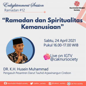 Dalam menyambut bulan Ramadan tahun 2021 Nurcholish Madjid Society (NCMS) kembali menyelenggarakan Enlightenment Session (Sesi Pencerahan). Pertemuan keduabelas menghadirkan Pengasuh Pesantren Darut Tauhid Arjawinangun Cirebon. Acara digelar pada Sabtu, 24 April 2021, pukul 16.00-17.00 WIB, dengan tema “Ramadan dan Spiritualitas Kemanusiaan”.
