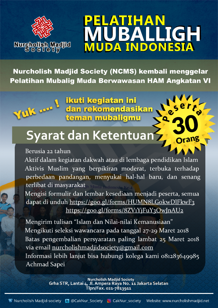 Nurcholish Madjid Society (NCMS) telah melaksanakan program Pelatihan Mubalig Muda sejak tahun 2012 silam. Pelatihan ini memadukan pendekatan komunikatif dan kognitif sekaligus. Partisipan akan dibekali pengetahuan dan metode berdakwah yang kreatif, tidak membosankan, dan tepat sasaran agar para pendengar memperoleh ilmu usai mendengarkan ceramah atau pengajian. Pelatihan ini khusus diperuntukkan bagi para Mubalig Muda yang terlibat pengajaran keislaman di sekolah-sekolah, kampus-kampus, dan pesantren-pesantren di Indonesia. Para peserta Pelatihan berasal dari berbagai universitas Islam, pesantren, dan para guru/as tidz di beragam lembaga pendidikan.