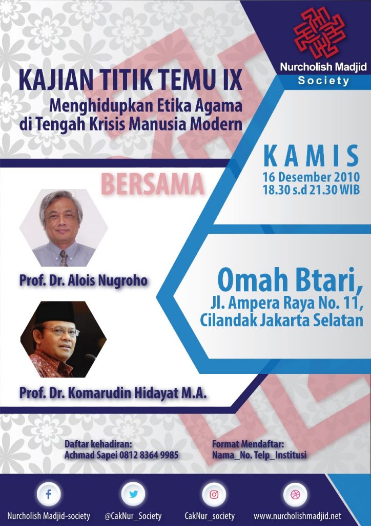 Nurcholish Madjid Society (NCMS) kembali menggelar Kajian TITIK-TEMU IX, dengan tema “Menghidupkan Etika Agama di tengah Krisis Manusia Modern”, narasumber yang akan hadir Prof. Dr. Alois Nugroho (Dosen Atma Jaya Jakarta) dan Prof. Dr. Komarudin Hidayat, M.A. (Guru Besar UIN Syarif HIdayatullah Jakarta) Bertempat di Omah Btari Sri, Jl. Ampera Raya No. 11, Cilandak, Jakarta Selatan, Kamis, 16 Desember 2010, Jam 18.30 s.d 21.30 WIB
