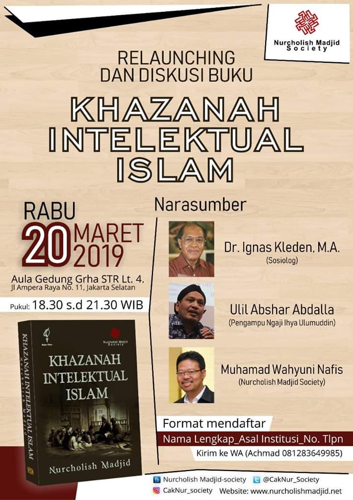 Buku antologi pemikiran Muslim hasil terjemahan dan suntingan Cak Nur (Prof. Dr. Nurcholish Madjid), yang terbit pertama kali tahun 1984, merupakan kumpulan pemikiran mendasar dari para filsuf dan pemikir Muslim terdahulu yang layak dijadikan sebagai basis epistemologi Islam. Tentu artikel-artikel yang diterjemahkan dan dimasukkan ke dalam buku ini adalah artikel pilihan dari setiap tokoh terkemuka pada masanya. Meski ide dan pemikiran-pemikiran dalam buku ini tergolong klasik, namun memberikan dasar penting yang dibutuhkan bagi pengembangan Islam dan kemoderenan di masa mendatang. Karena itu, Nurcholish Madjid Society (NCMS) merasa perlu untuk menerbitkan kembali buku Khazanah Intelektual Islam ini.